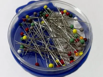 Bardzo długie i bardzo ostre szpilki ze szklanymi kolorowymi łebkami.
