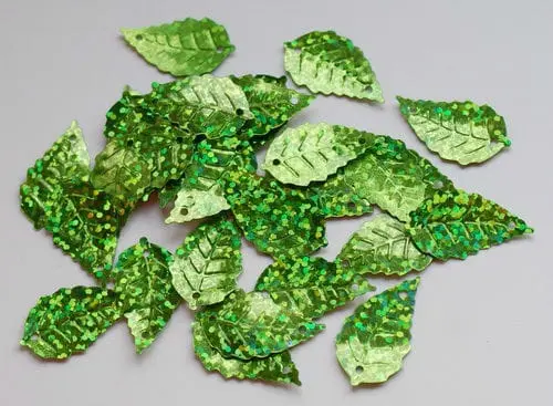 Cekiny listki w zielonym opalizującym kolorze. Posiadają dwie dziurki, po jednej z każdej strony cekina.