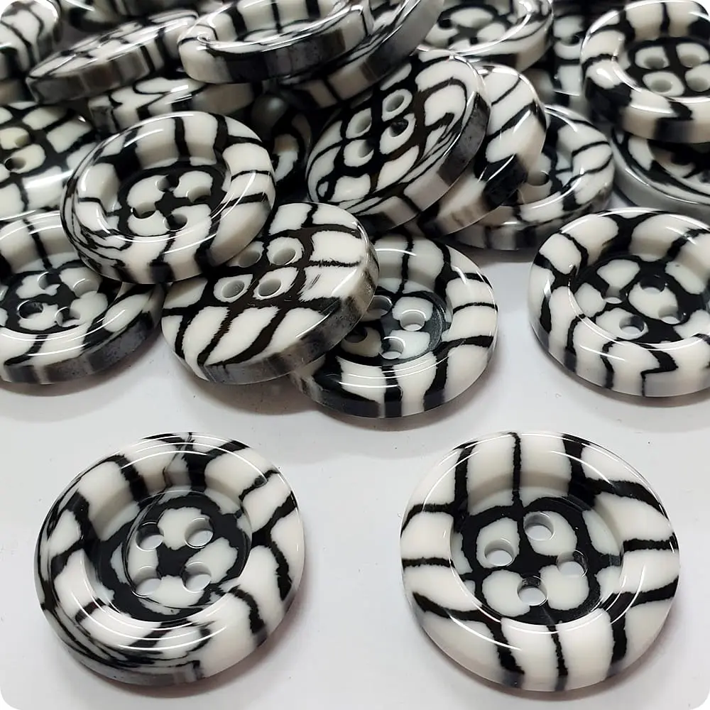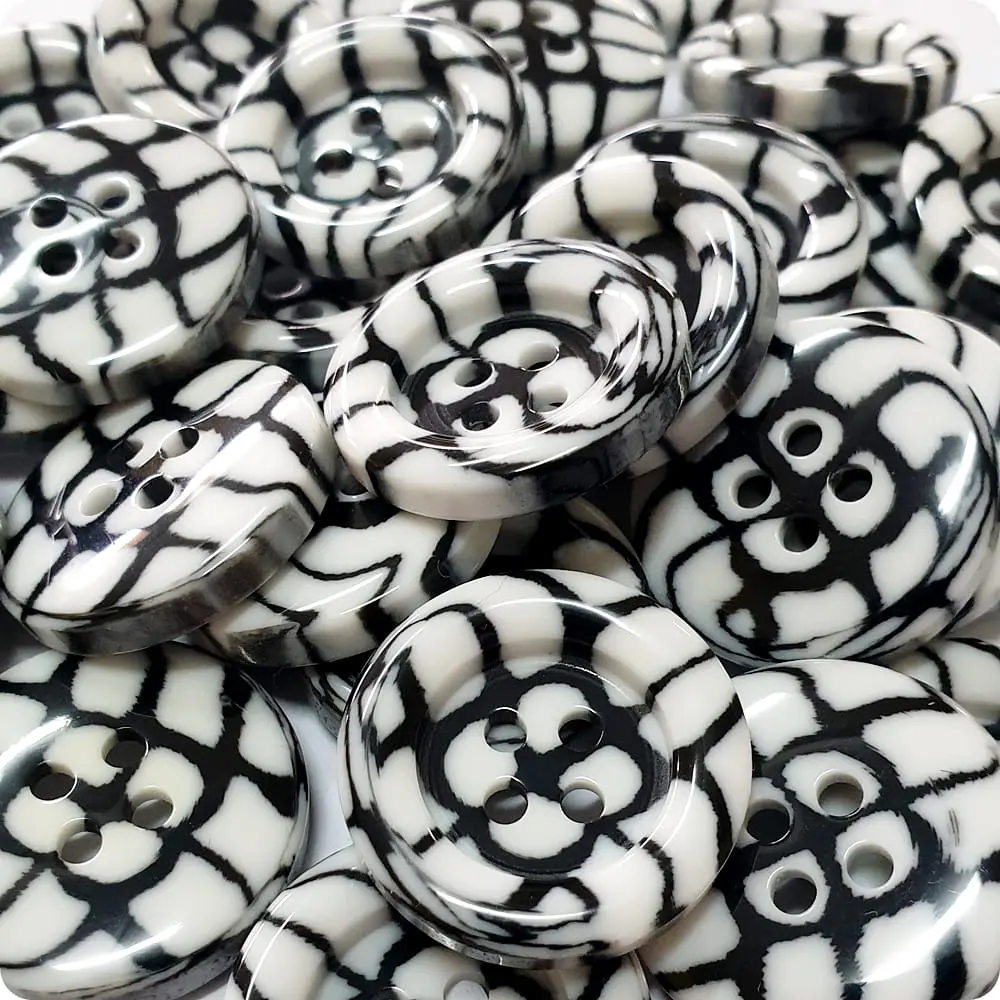 Lekki guzik ozdobny, nie obciąża materiału. Guzik w biało czarną kratę.
