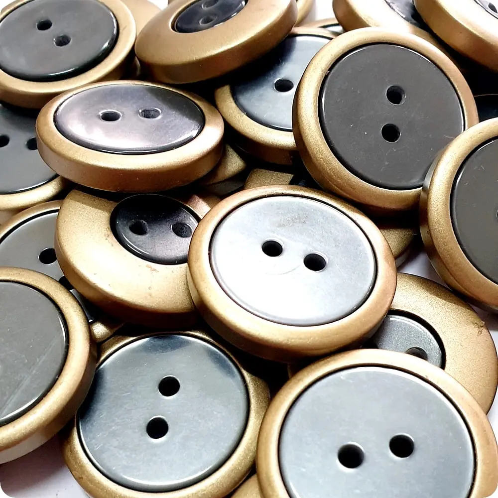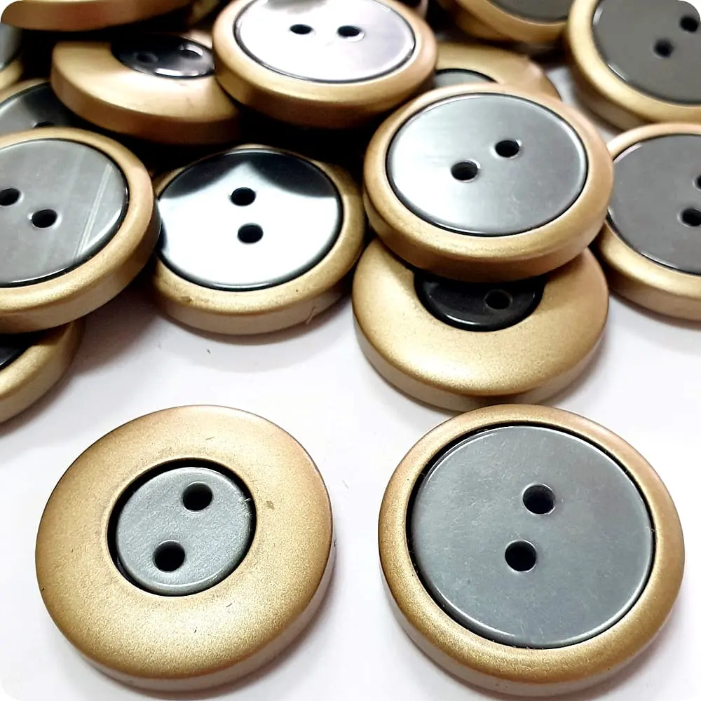 Lekki guzik ozdobny. Nie obciąża materiału. Guzik szary z matową złotą obwódką. W zależności od potrzeby można go przyszyć stroną „bardziej szarą” lub „bardziej złotą„.