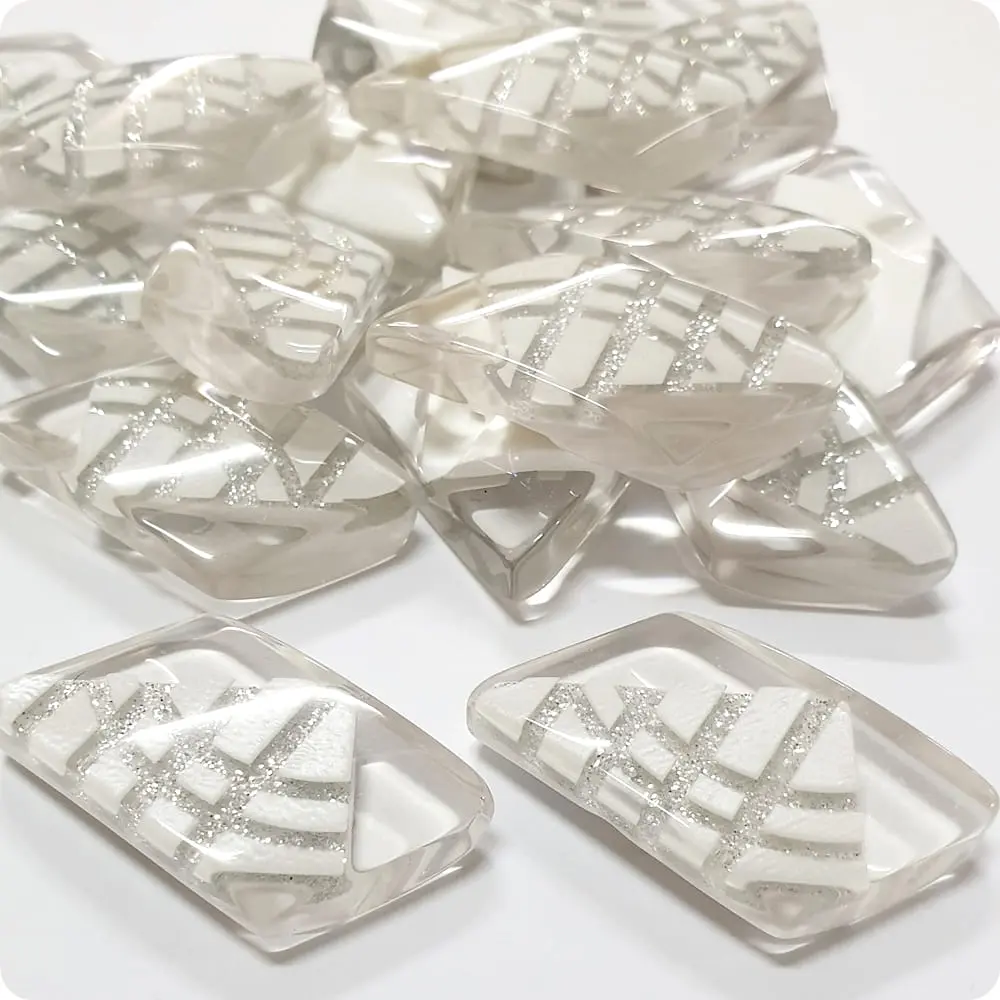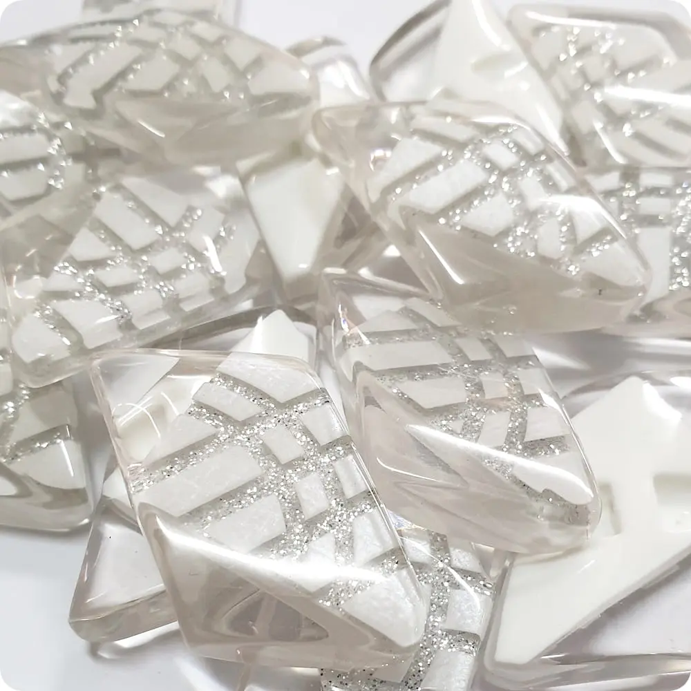 Przezroczysty guzik ozdobny z biało brokatową mozaiką.