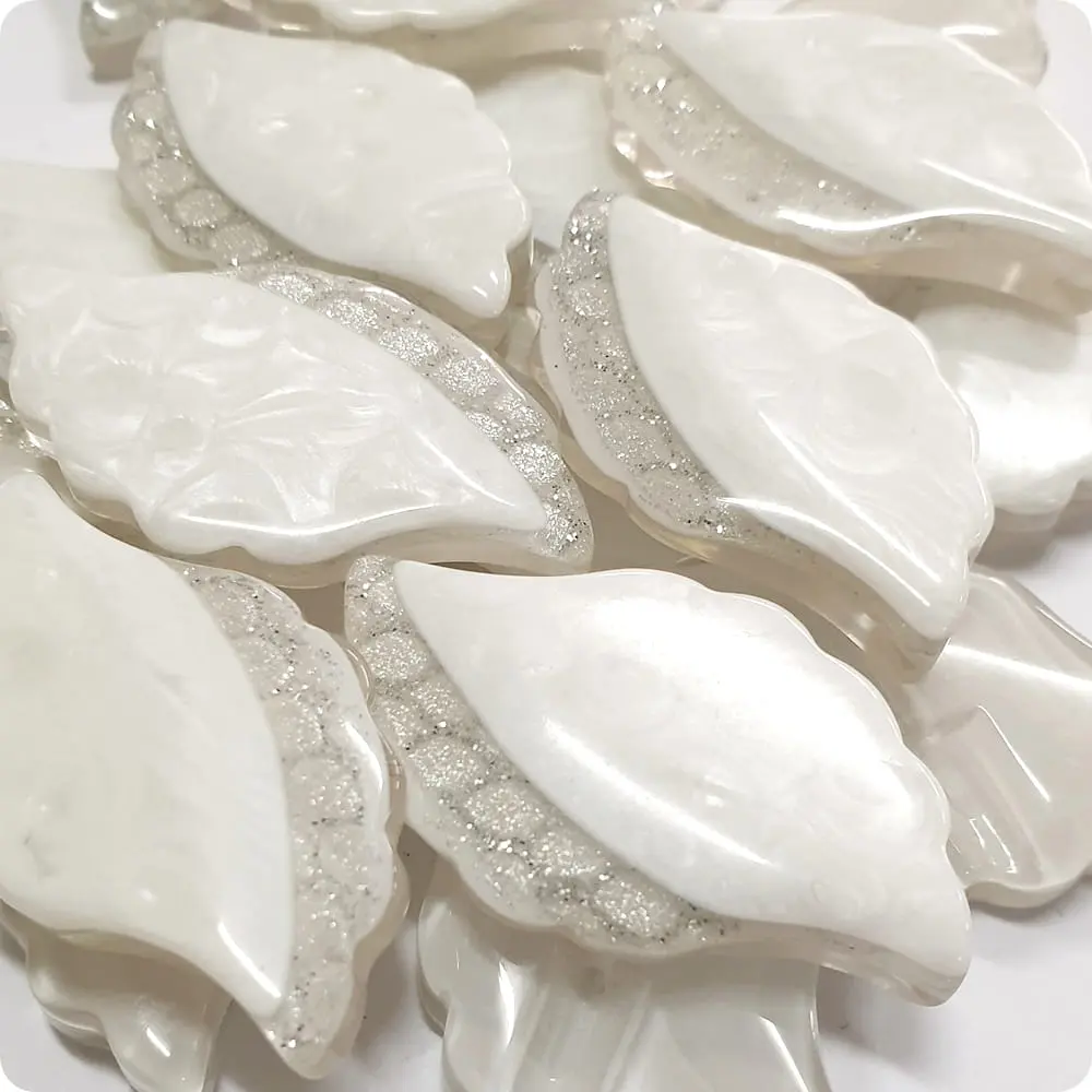 Ozdobny guzik perłowo-biały z brokatowo-srebrnym akcentem.