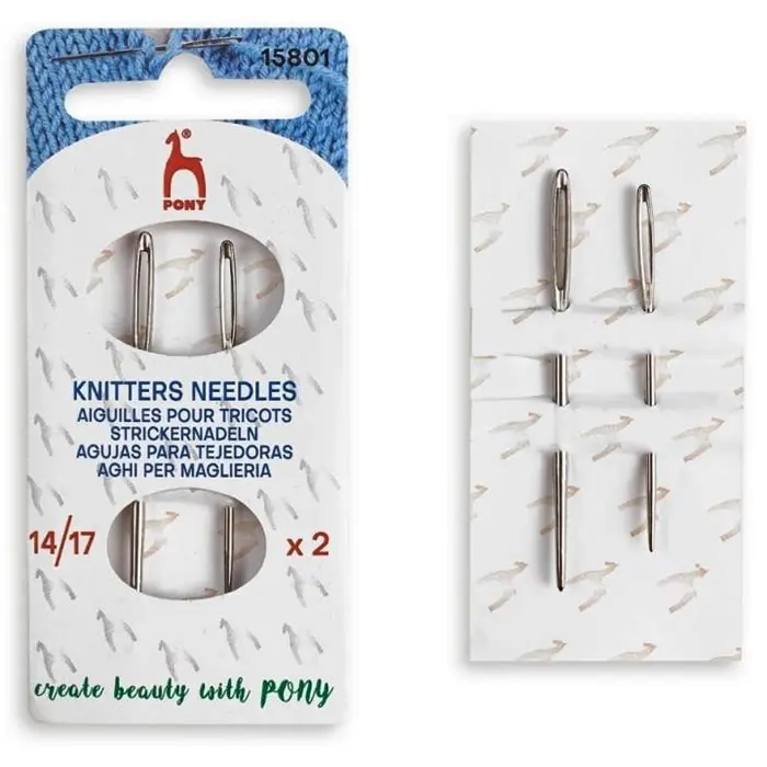 Grube igły dziewiarskie z grubym uchem i zaokrąglonym czubkiem.