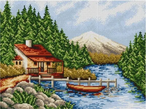 Biała kanwa z nadrukowanym wzorem. Do kanwy dołączona jest informacja z potrzebną kolorystyką muliny i jej ilością w poszczególnych kolorach.