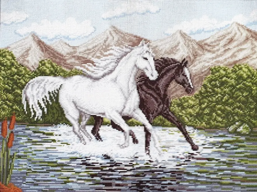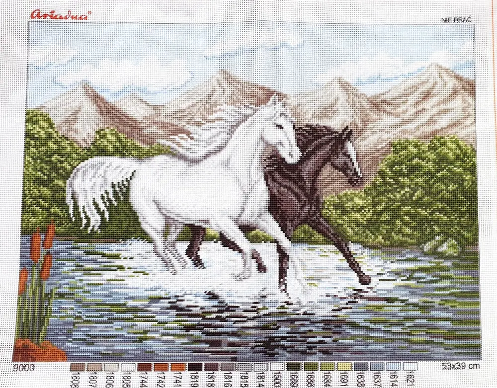 Biała kanwa z nadrukowanym wzorem. Do kanwy dołączona jest informacja z potrzebną kolorystyką muliny i jej ilością w poszczególnych kolorach.