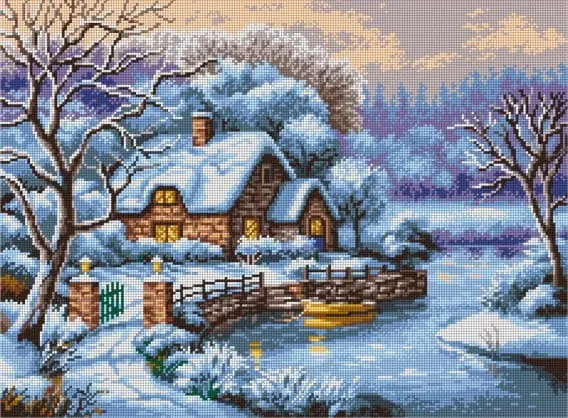 Biała kanwa z nadrukowanym wzorem. Do kanwy dołączona jest informacja z potrzebną kolorystyką muliny i jej ilością w poszczególnych kolorach.