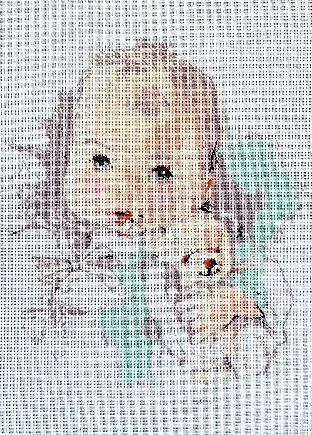 Biała kanwa z nadrukowanym wzorem. Do kanwy dołączona jest informacja z potrzebną kolorystyką muliny i jej ilością w poszczególnych kolorach.