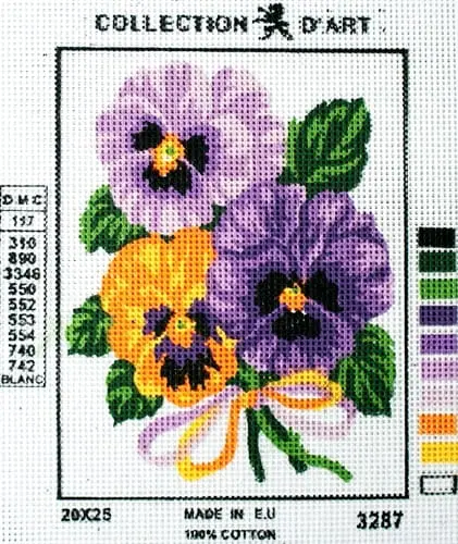 Biała kanwa z nadrukowanym wzorem. Do kanwy dołączona jest informacja z potrzebną kolorystyką muliny i jej ilością w poszczególnych kolorach.