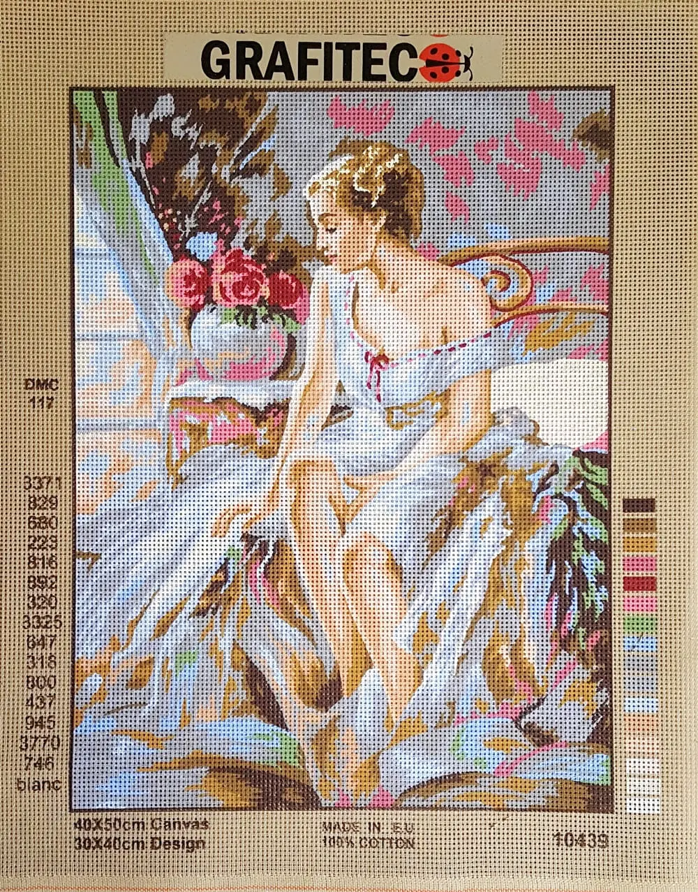 Beżowa kanwa z nadrukowanym wzorem. Do kanwy dołączona jest informacja z potrzebną kolorystyką muliny i jej ilością w poszczególnych kolorach.