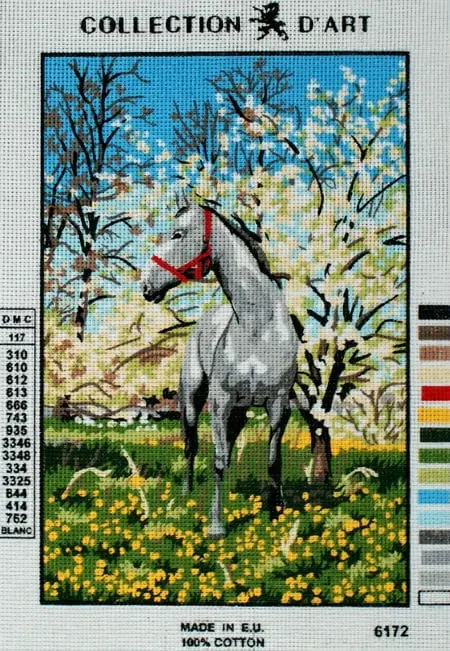 Biała kanwa z nadrukowanym wzorem. Do kanwy dołączona jest informacja z potrzebną kolorystyką muliny i jej ilością w poszczególnych kolorach.