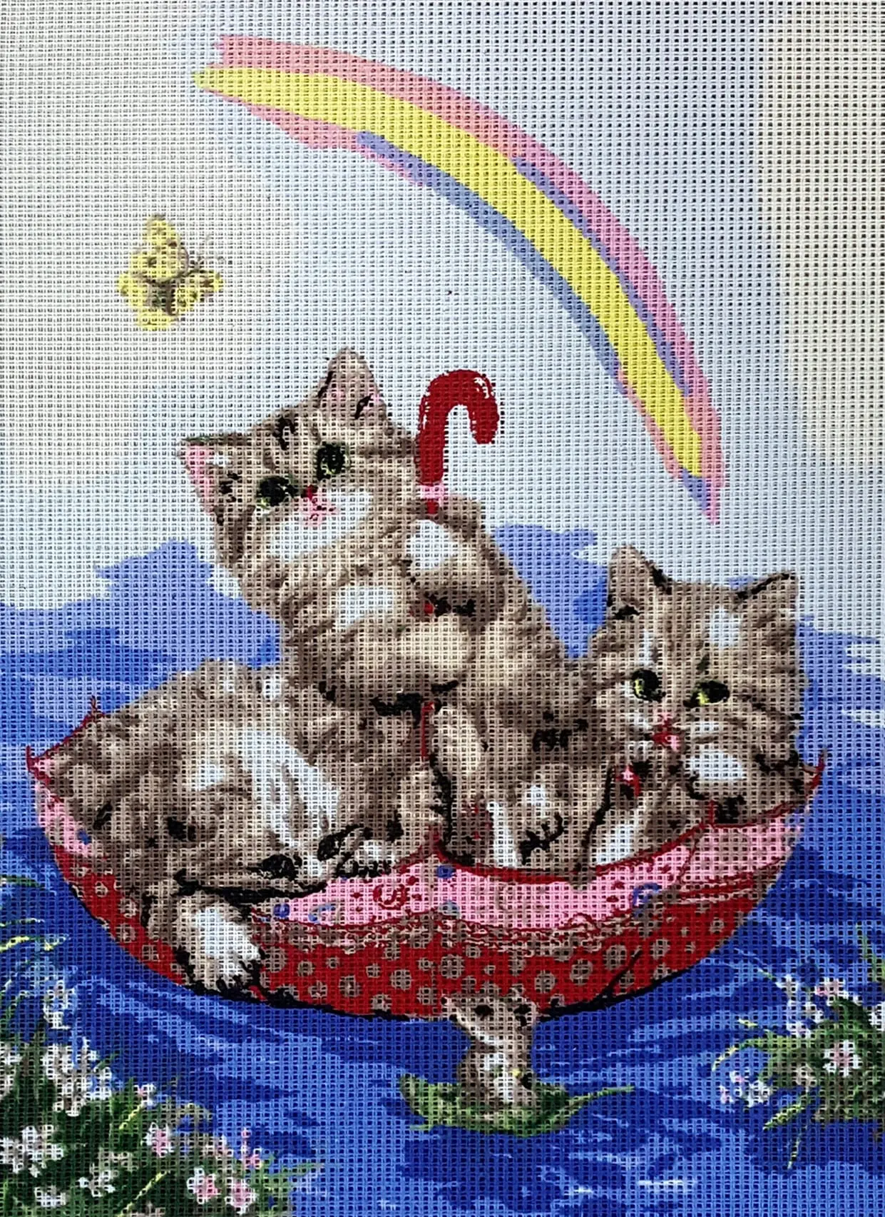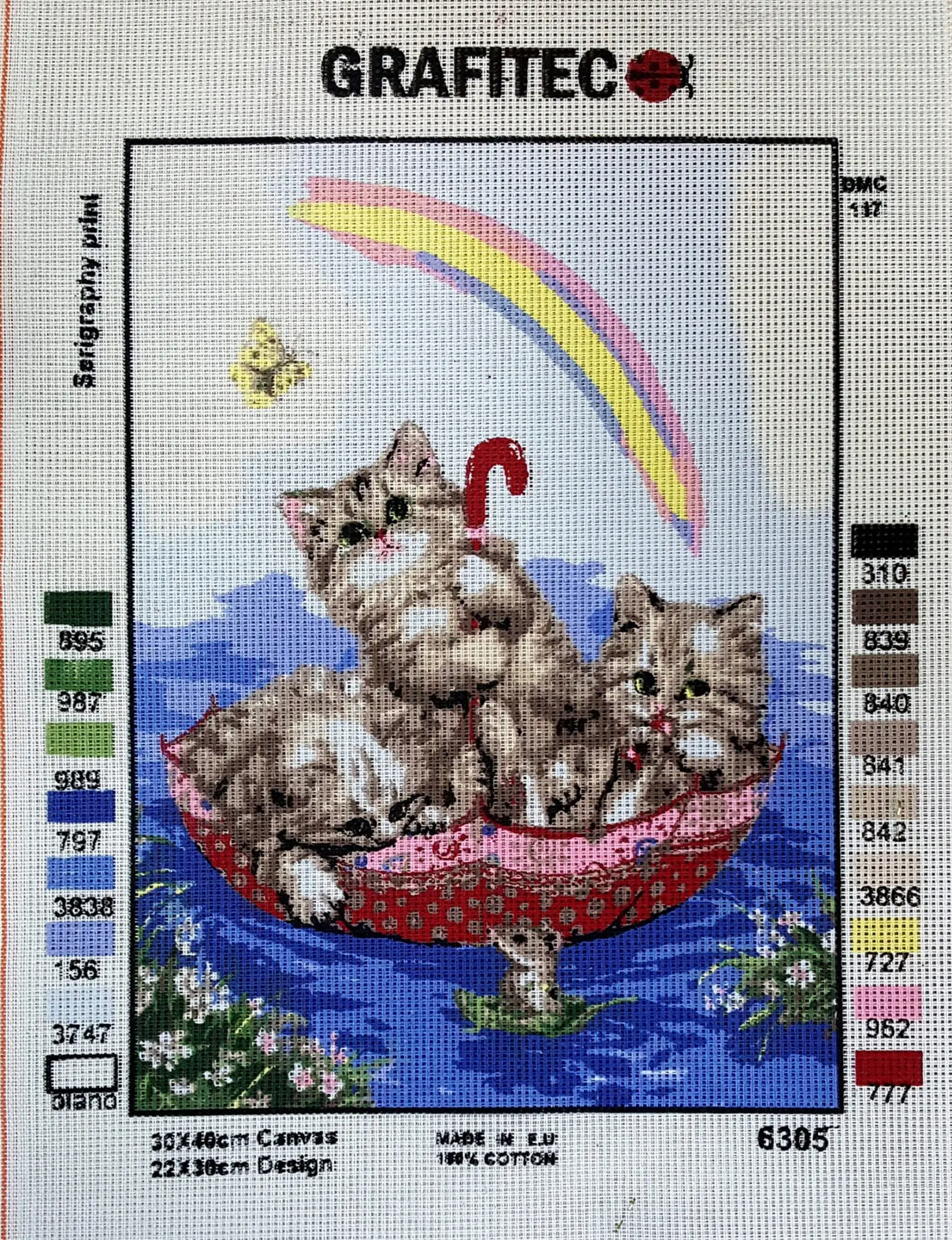 Biała kanwa z nadrukowanym wzorem. Do kanwy dołączona jest informacja z potrzebną kolorystyką muliny i jej ilością w poszczególnych kolorach.