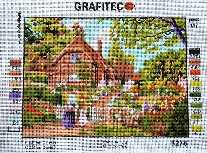 Biała kanwa z nadrukowanym wzorem. Do kanwy dołączona jest informacja z potrzebną kolorystyką muliny i jej ilością w poszczególnych kolorach.
