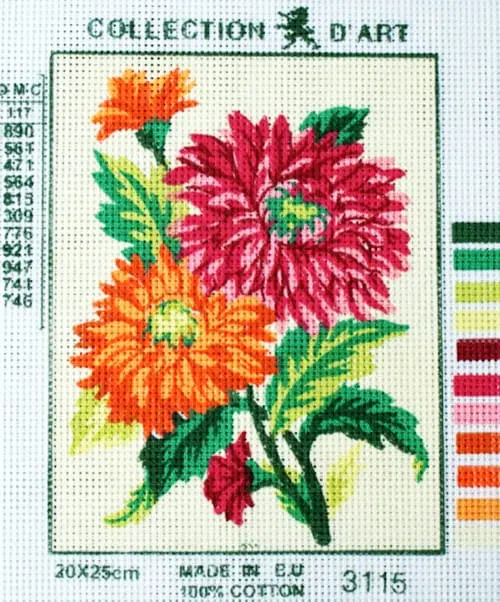 Biała kanwa z nadrukowanym wzorem. Do kanwy dołączona jest informacja z potrzebną kolorystyką muliny i jej ilością w poszczególnych kolorach.