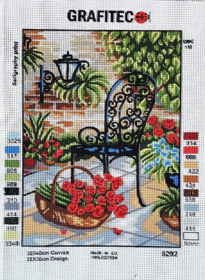 Biała kanwa z nadrukowanym wzorem. Do kanwy dołączona jest informacja z potrzebną kolorystyką muliny i jej ilością w poszczególnych kolorach.