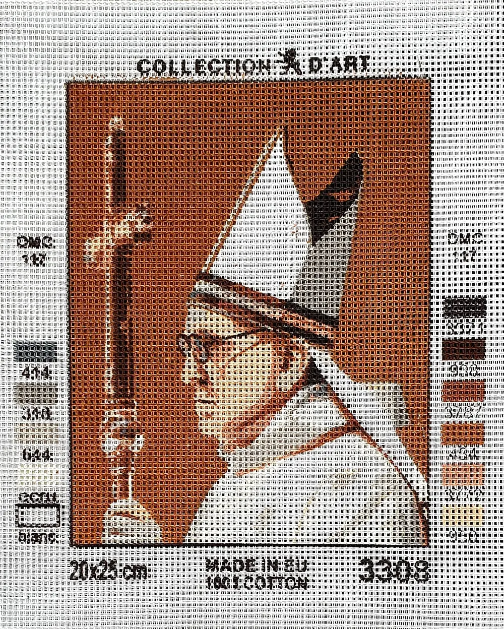 Biała kanwa z nadrukowanym wzorem. Do kanwy dołączona jest informacja z potrzebną kolorystyką muliny i jej ilością w poszczególnych kolorach.