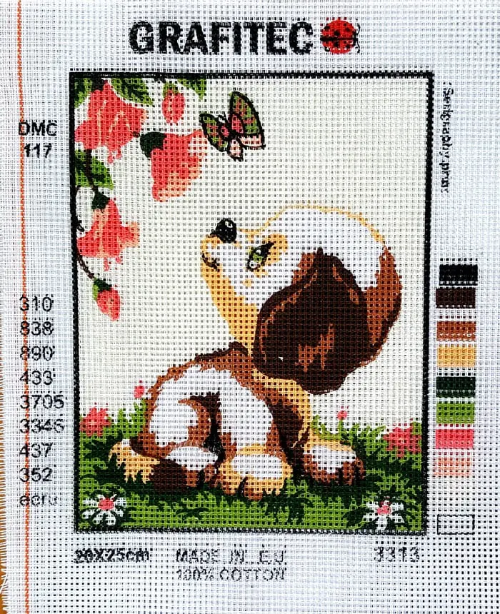 Biała kanwa z nadrukowanym wzorem. Do kanwy dołączona jest informacja z potrzebną kolorystyką muliny i jej ilością w poszczególnych kolorach.