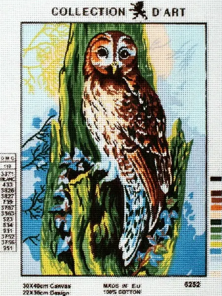 Biała kanwa z nadrukowanym wzorem. Do kanwy dołączona jest informacja z potrzebną kolorystyką muliny i jej ilością w poszczególnych kolorach.