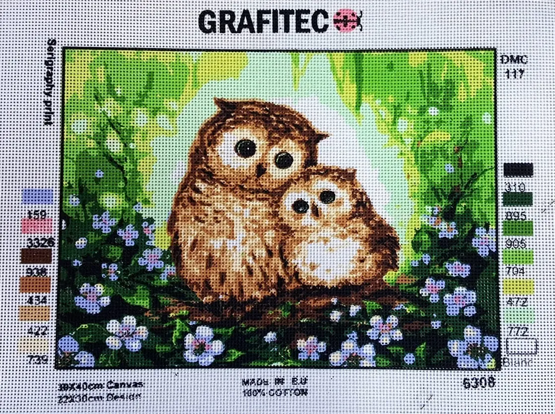 Biała kanwa z nadrukowanym wzorem. Do kanwy dołączona jest informacja z potrzebną kolorystyką muliny i jej ilością w poszczególnych kolorach.