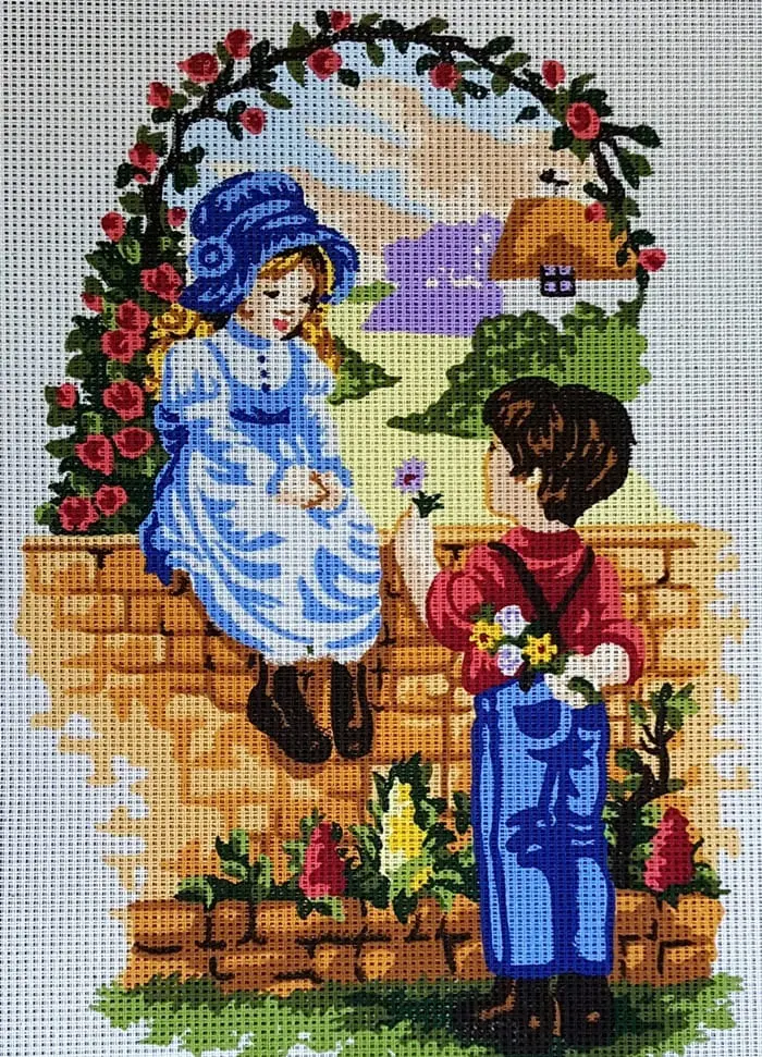 Biała kanwa z nadrukowanym wzorem. Do kanwy dołączona jest informacja z potrzebną kolorystyką muliny i jej ilością w poszczególnych kolorach.