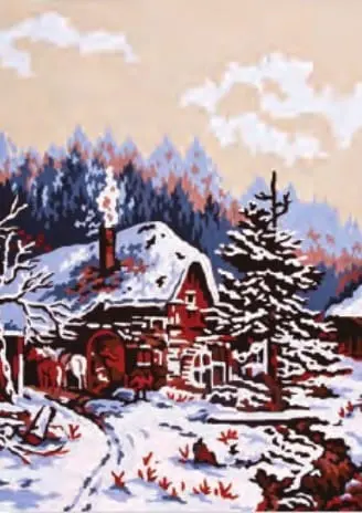 Biała kanwa z nadrukowanym wzorem. Do kanwy dołączona jest informacja z potrzebną kolorystyką muliny i jej ilością w poszczególnych kolorach.