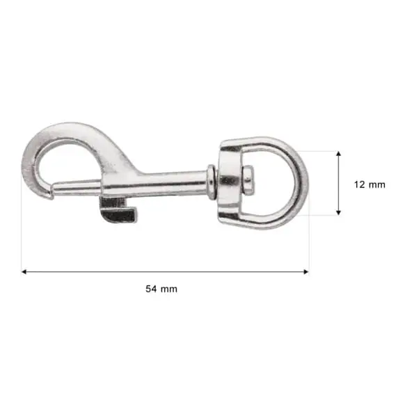 Karabińczyk metalowy 12×54 mm SREBRNY jest wykonany z wysokogatunkowego metalu, gwarantuje długotrwałe użytkowanie i odporność na uszkodzenia