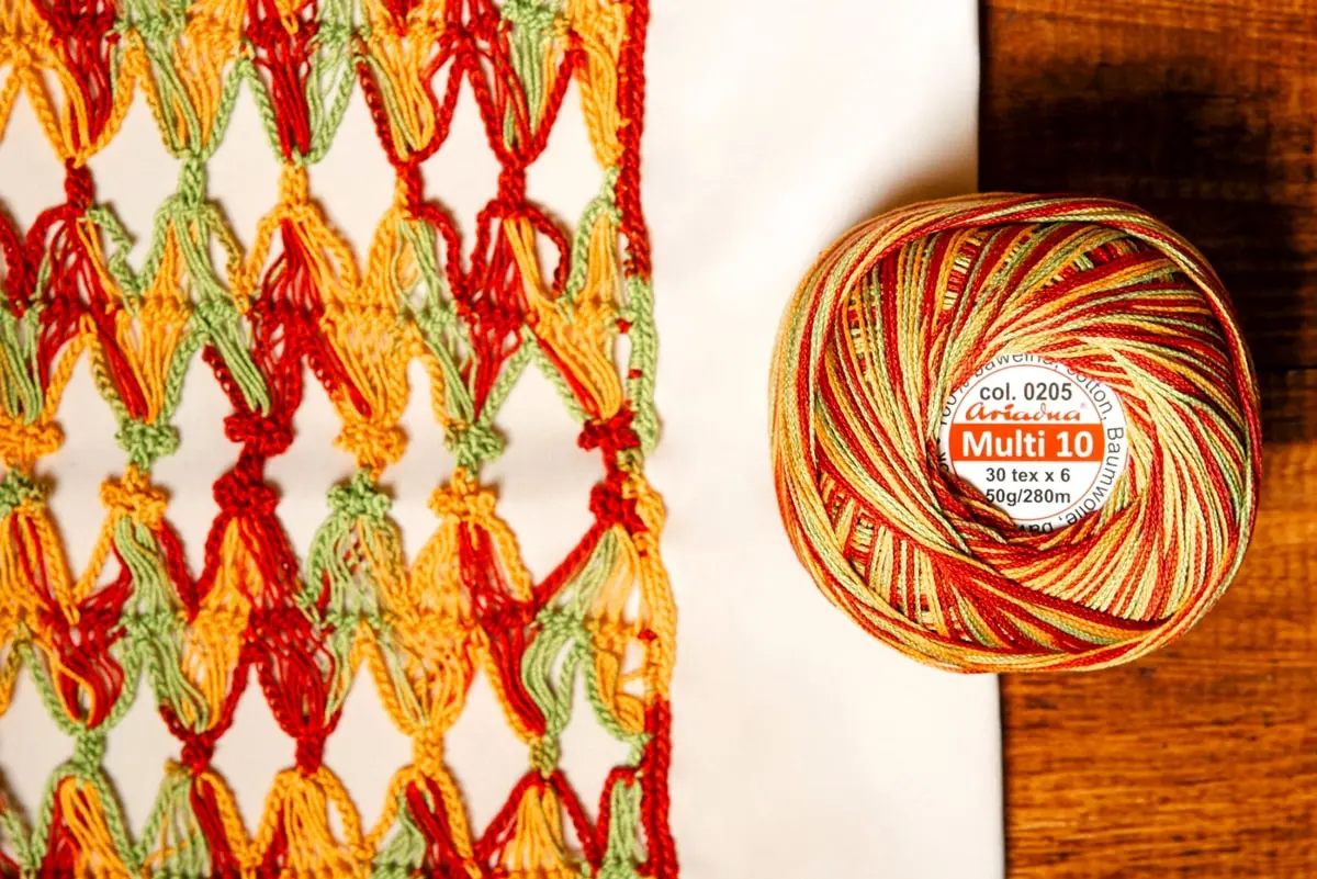 Ten niezwykły kordonek Multi 10 przeznaczony jest do różnego rodzaju prac – można z niego wykonać serwetki, obrusy, delikatne bluzeczki, sweterki czy dziecięce sukienki. Dostępny mix kolorów sprawia, że można wybrać zarówno coś pastelowego i delikatnego, jak i coś żywego oraz bardzo intensywnego. Można też postawić na jesienne odcienie. Technika jest dowolna. Do precyzyjnego wykonania frywolitki polecamy użyć szydełka, cienkich drutów czy czółenka. Grubość opisana jako „dziesiątka” jest najbardziej uniwersalna wśród kordonków. Nie jest zbyt cienka ani zbyt gruba – sięga po nią większość klientów.