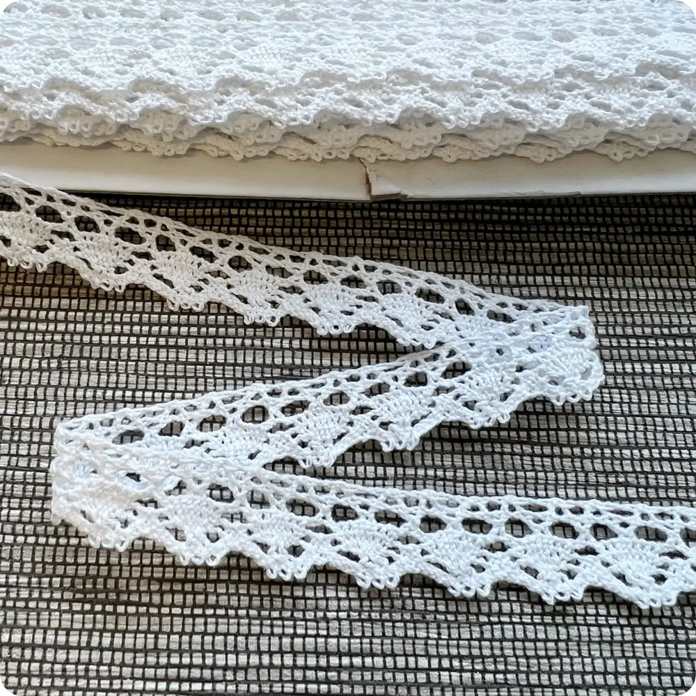 Koronka poliestrowa swoim wyglądem i strukturą przypomina koronkę bawełnianą. Jest mięsista i ma wyraźny wzór.