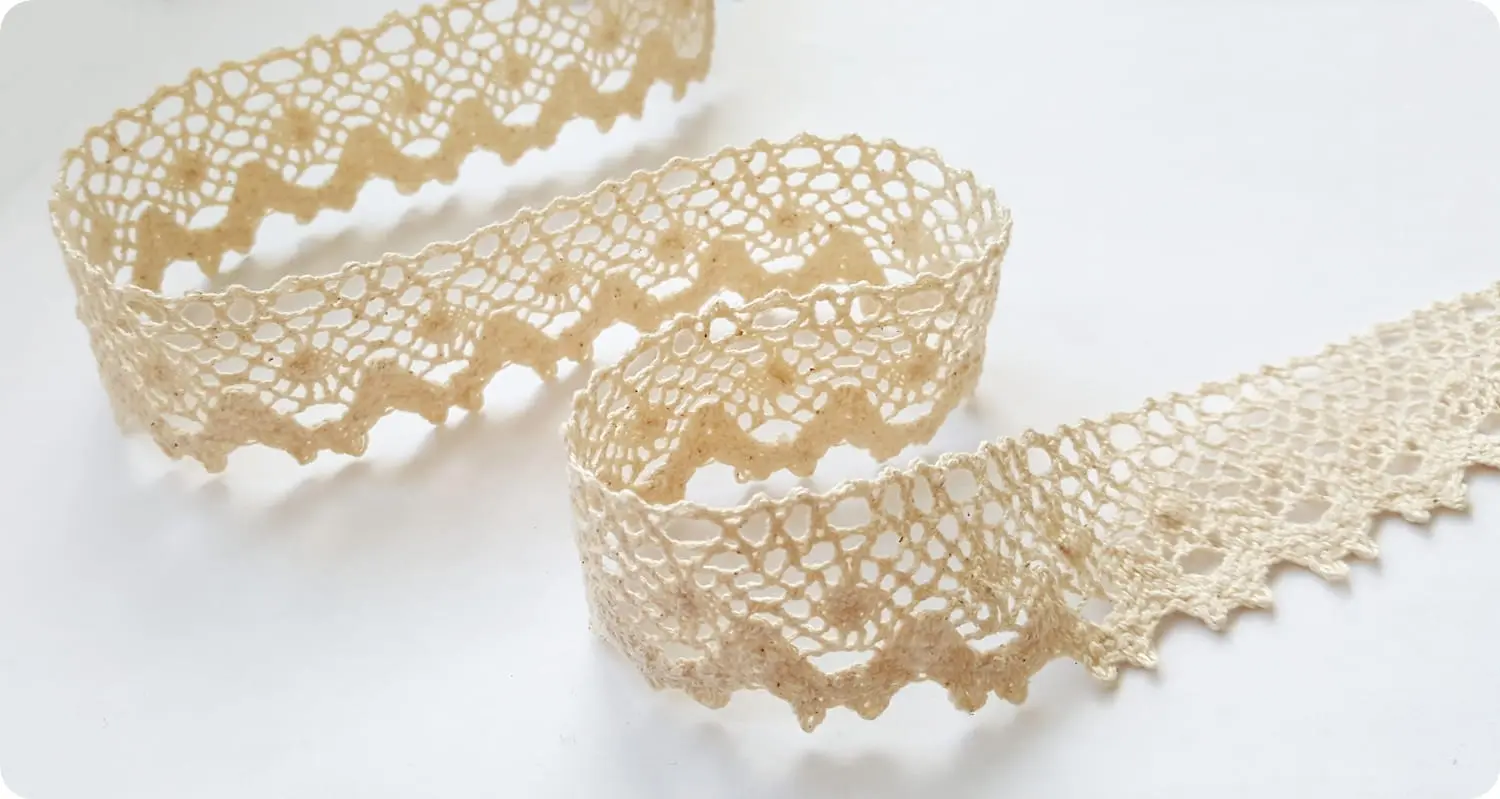 Koronka poliestrowa swoim wyglądem i strukturą przypomina koronkę bawełnianą. Jest mięsista i ma wyraźny wzór.