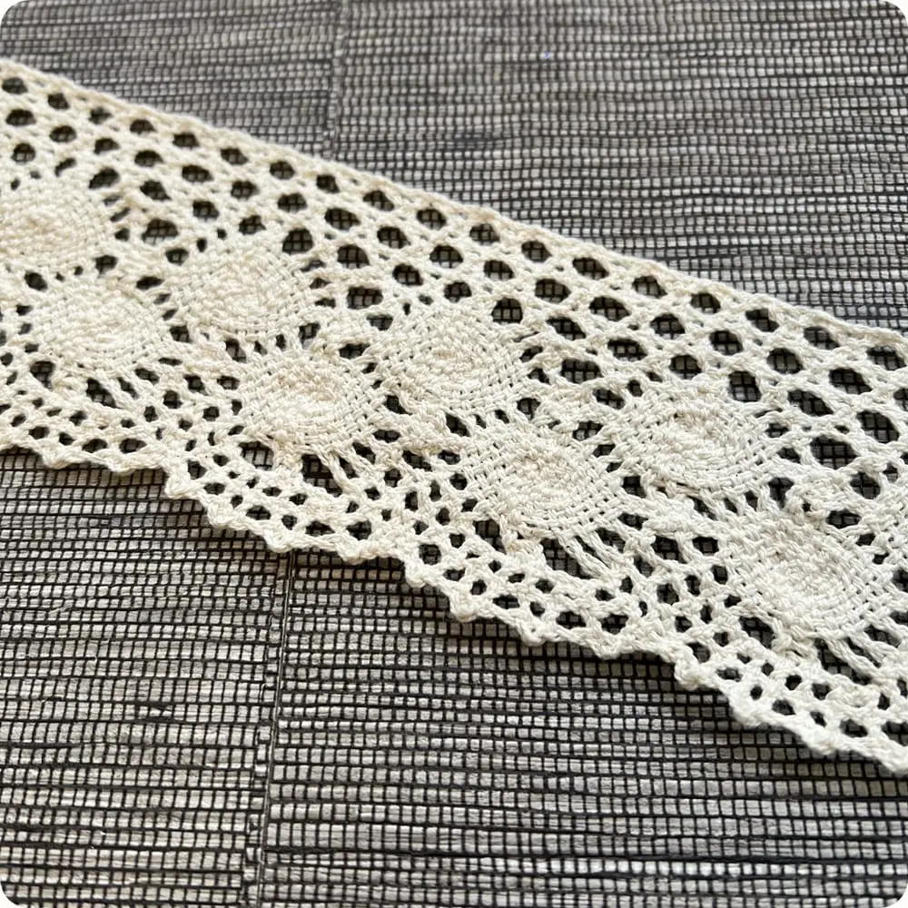 Koronka poliestrowa swoim wyglądem i strukturą przypomina koronkę bawełnianą. Jest mięsista i ma wyraźny wzór.