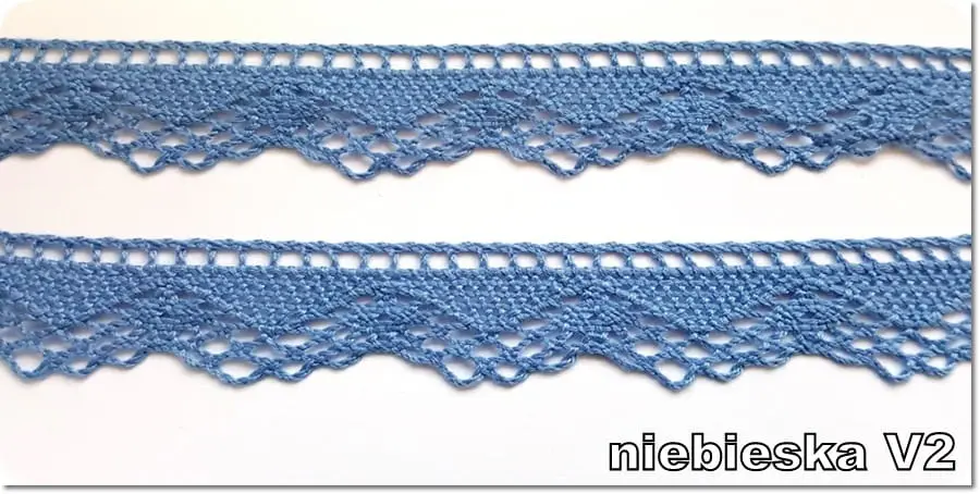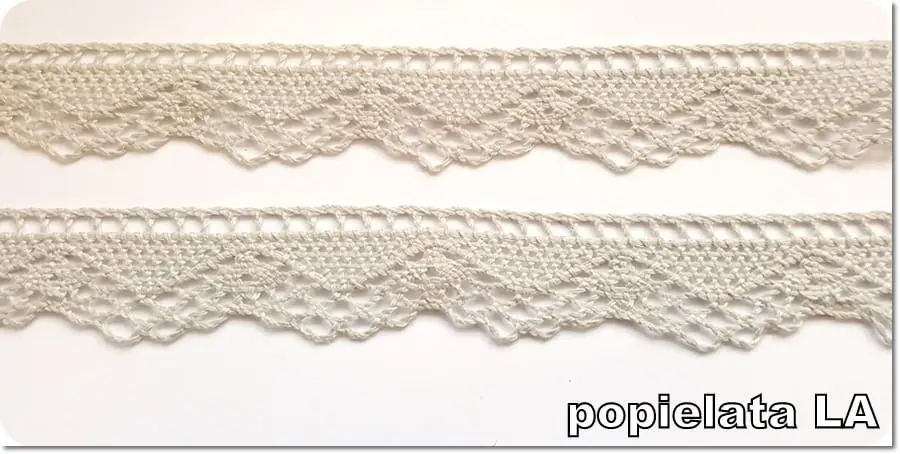 Koronka poliestrowa swoim wyglądem i strukturą przypomina koronkę bawełnianą. Jest mięsista i ma wyraźny wzór.