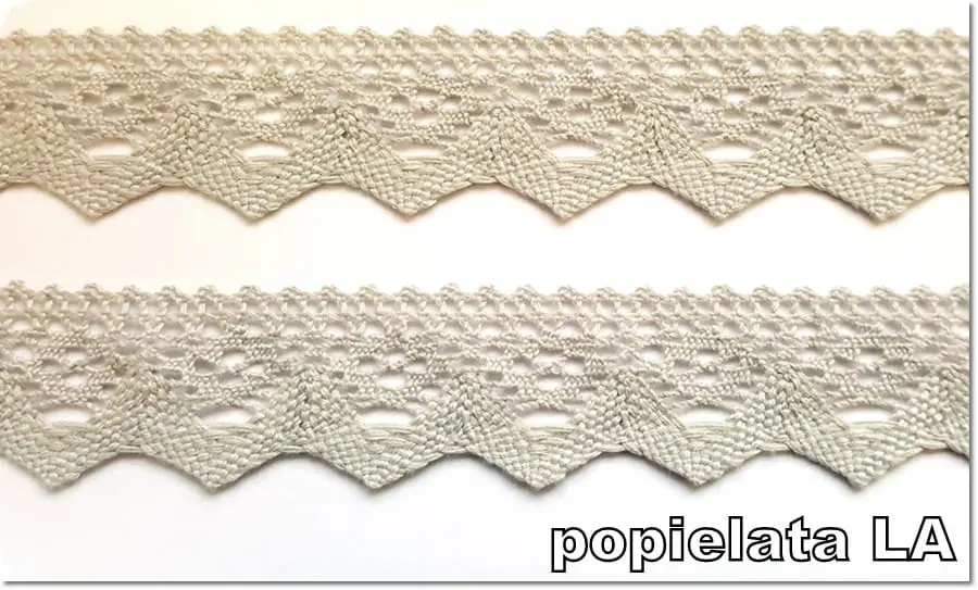 Koronka poliestrowa swoim wyglądem i strukturą przypomina koronkę bawełnianą. Jest mięsista i ma wyraźny wzór.