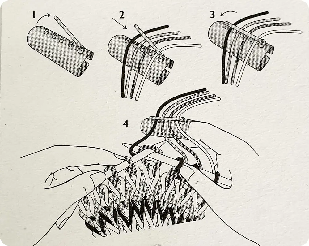 Plastikowy naparstek do robótek dziewiarskich, umożliwia pracę z 4 nitkami.