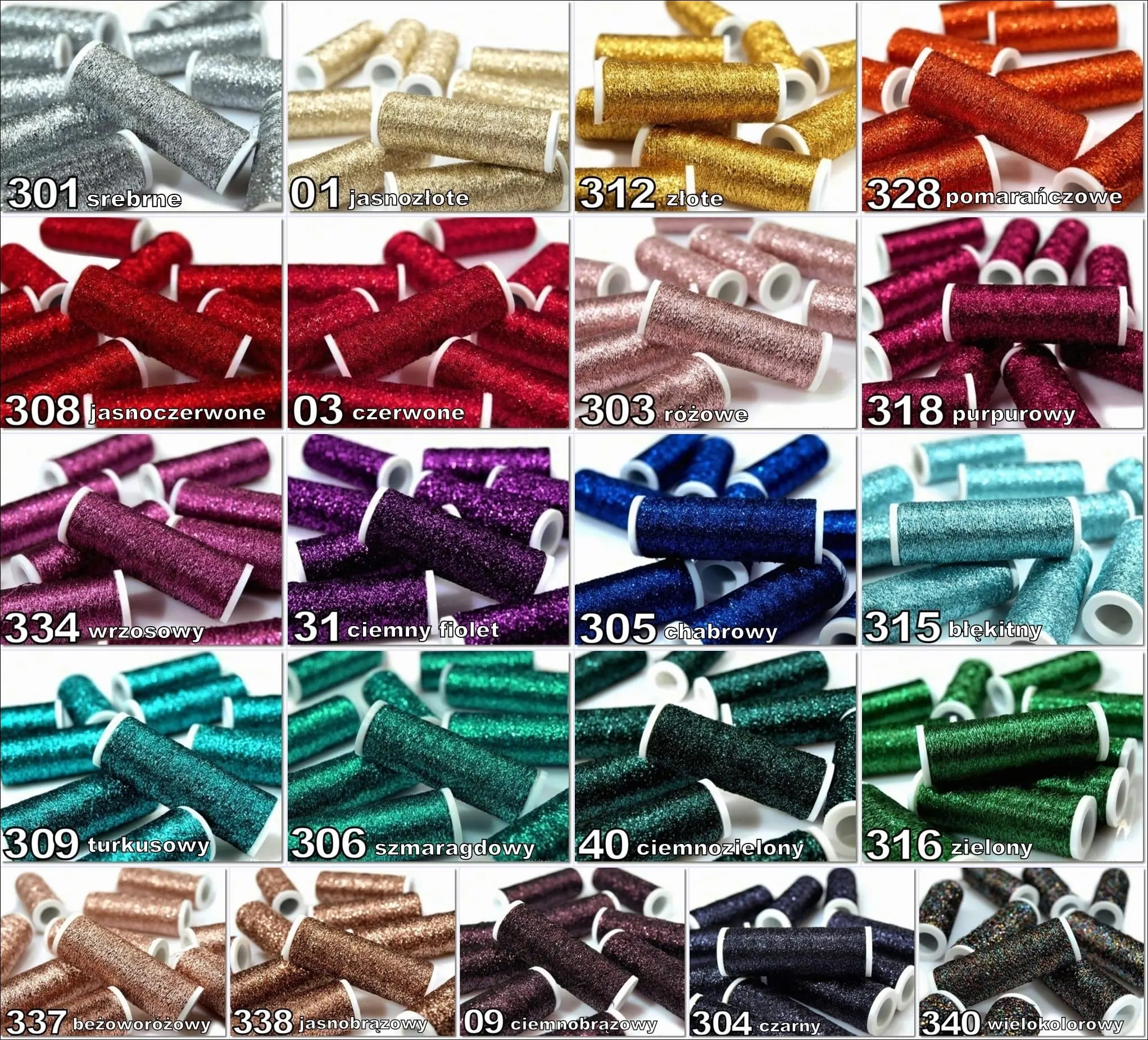 301 srebrny ,01 jasnozłoty ,312 złoty ,340 wielokolorowy ,03 czerwony ,09 ciemnobrązowy ,31 ciemny fiolet ,40 ciemnozielony ,303 różowy ,305 chabrowy ,304 czarny ,306 szmaragdowy ,308 jasnoczerwony ,309 turkusowy ,315 błękitny ,316 zielony ,318 purpurowy ,328 pomarańczowy ,334 wrzosowy ,337 beżoworóżowy ,338 jasnobrązowy |