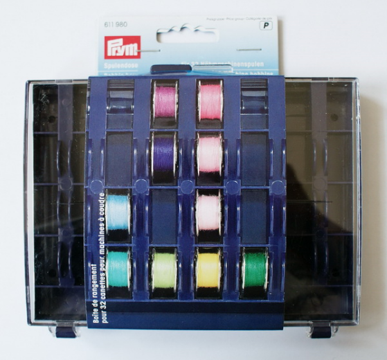 Pudełko na szpulki krawieckie PRYM, które pomieści aż 32 szpulki.