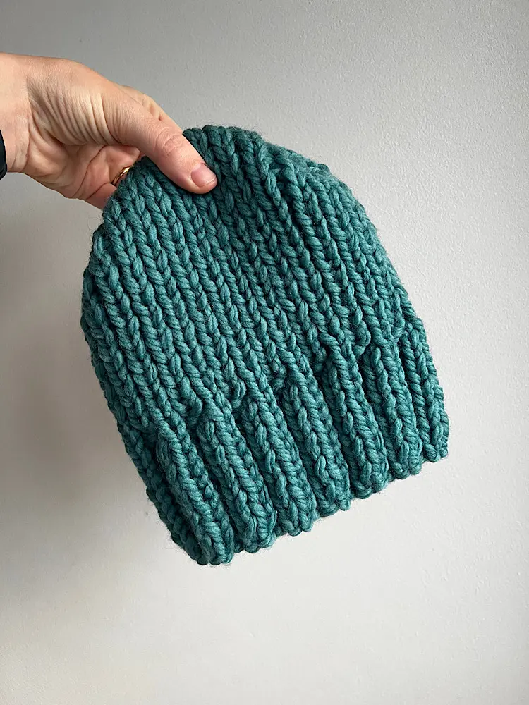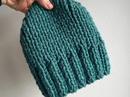 Ręcznie robiona czapa w szmaragdowym kolorze.
