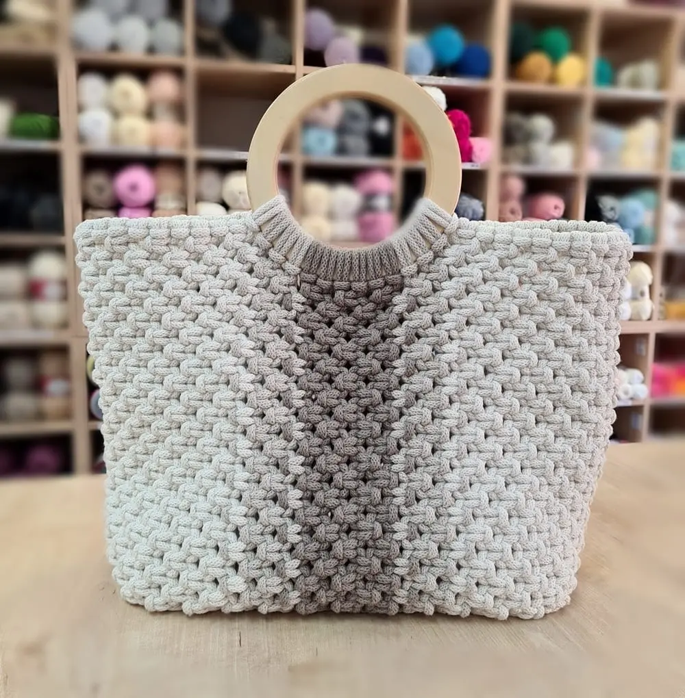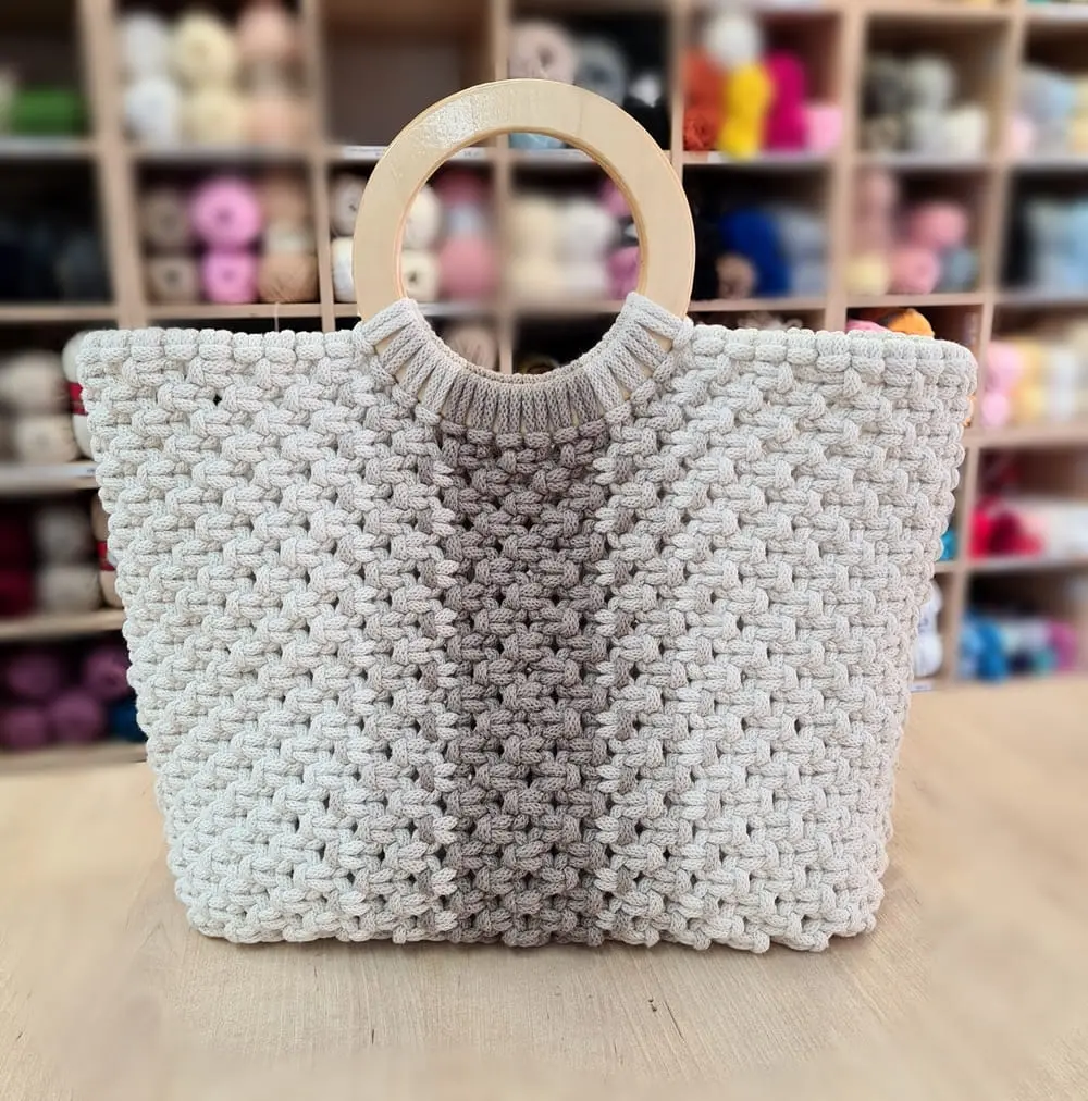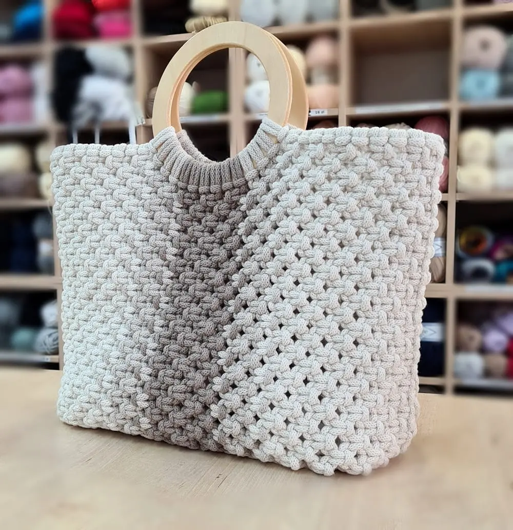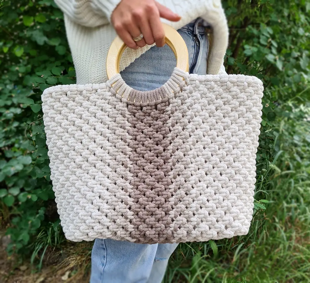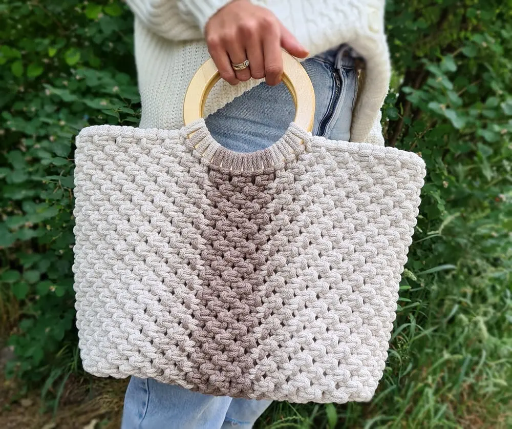 Piękna, wyjątkowa torba wykonana ręcznie. Posiada drewniane, wygodne rączki. Torba wykonana jest ze sznurka w modnych odcieniach beżu. Świetna na co dzień, efektowna i pojemna.
