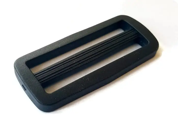 Plastikowy regulator przesuwny do regulowania długości pasków w plecakach czy torebkach. Ma kształt prostokąta.