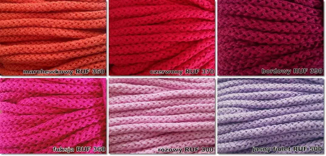 ecru ,pomarańczowy JUR 1450 ,czerwony RUF-370 ,bordowy RUF 390 ,fuksja RUF 360 ,różowy RUF 300 ,jasny fiolet RUF 500 ,ciemna zieleń RUF 680 ,błękitny RUF 400 ,granatowy ROR 14 ,beżowy ROR 23 ,jasny szary RUF 100 ,szary RUF 125 ,czarny RUF 900 ,żółty JUR 1130 ,pistacjowy JUR 1221 ,brązowy ROR 19 ,biały RUF 100 ,antracyt RUF 150 ,ciemny fiolet RUF 550 ,chabrowy RUF 490 ,niebieski RUF 480 ,zielony KAL 402 ,marchewkowy RUF 350 ,miętowy RUF 600 ,turkusowy ,jasnożółty ,musztardowy ,jasna oliwka |