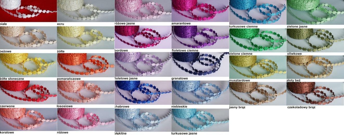 biały ,ecru ,beżowy ,jasnożółty ,żółty słoneczny ,pomarańczowy ,czerwony ,łososiowy ,koralowy ,różowy ,jasnoróżowy ,amarantowy ,bordowy ,ciemny fiolet ,jasny fiolet ,granatowy ,chabrowy ,niebieski ,błękitny ,jasny turkus ,ciemny turkus ,jasnozielony ,ciemnozielony ,oliwkowy ,musztardowy ,złoty beż ,jasny brąz ,czekoladowy |