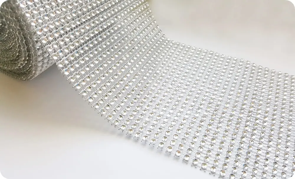 Ozdobna taśma imitująca taśmę z cyrkoniami może być wykorzystywana do ozdabiania lub przedłużania odzieży oraz do różnego rodzaju dekoracji, stroików itp. Taśmę można dowolnie docinać do potrzebnej szerokości. Nie stanowi też problemu wycięcie z taśmy dowolnego kształtu.
