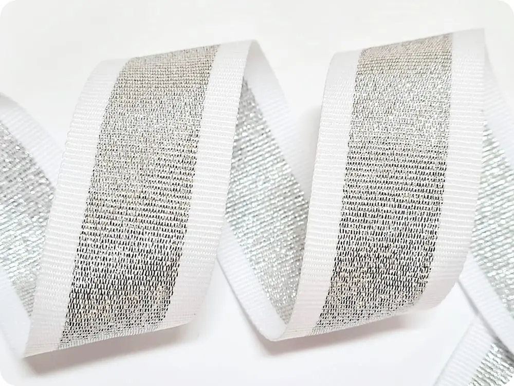 Strona główna » Pasmanteria on-line » TAŚMY » Taśmy ozdobne » TAŚMA RYPSOWA LAMPASOWA 30 mm – BIAŁO-SREBRNA