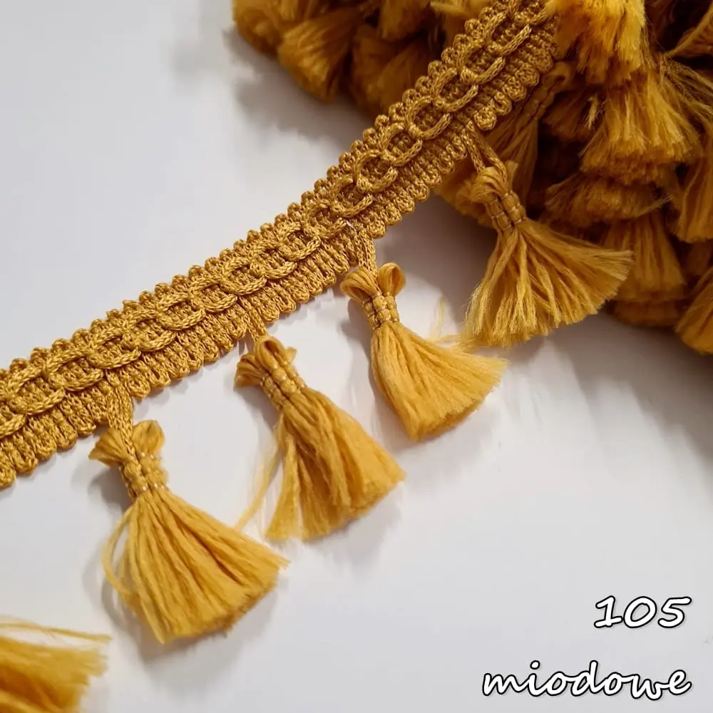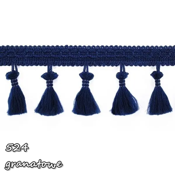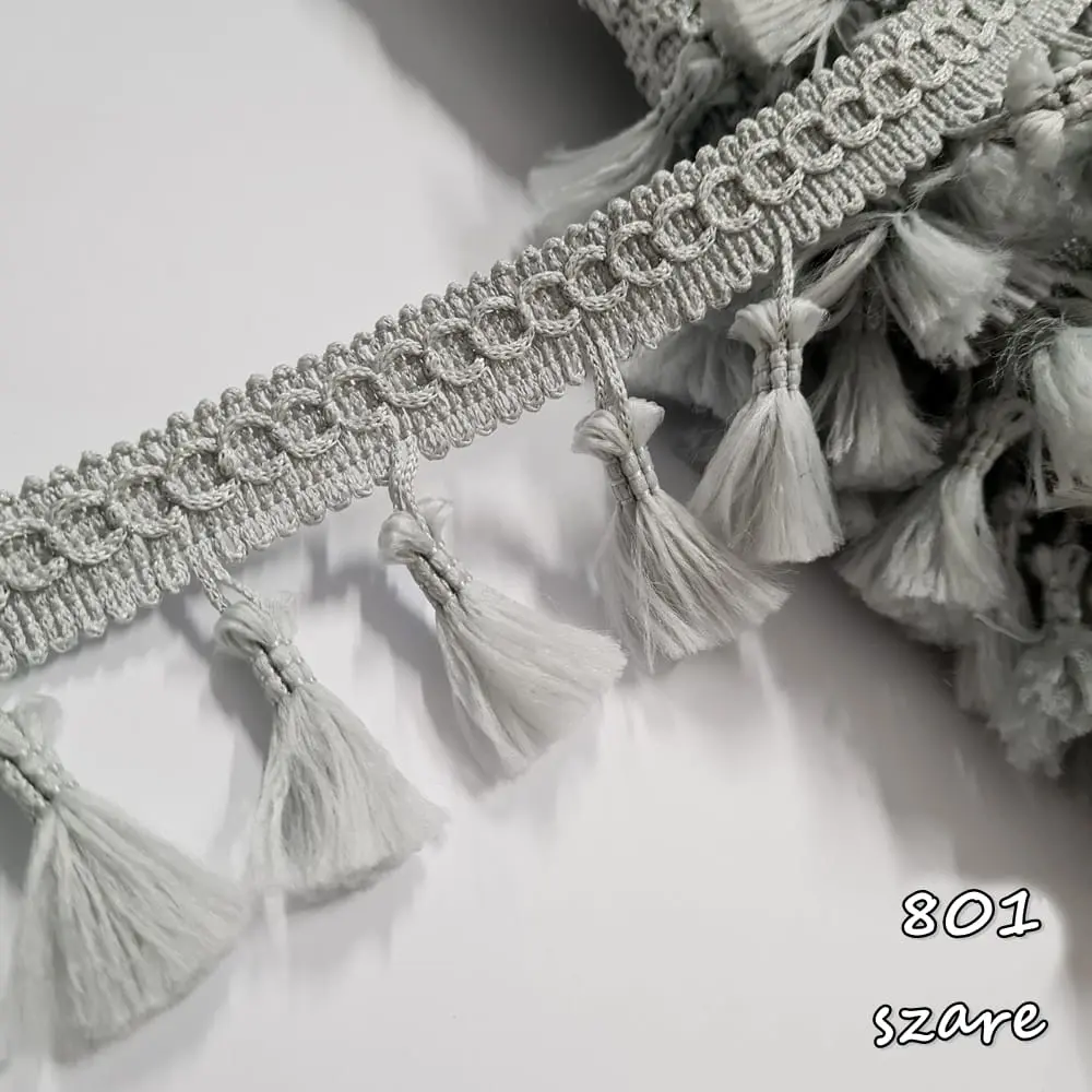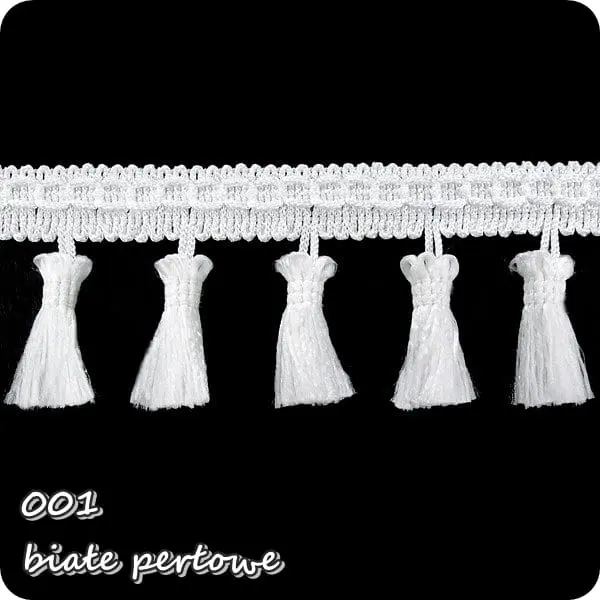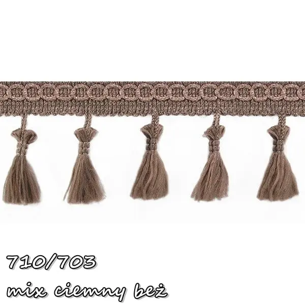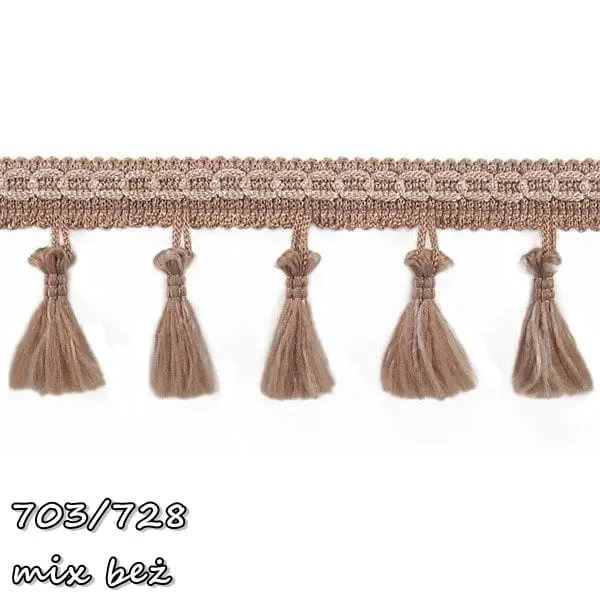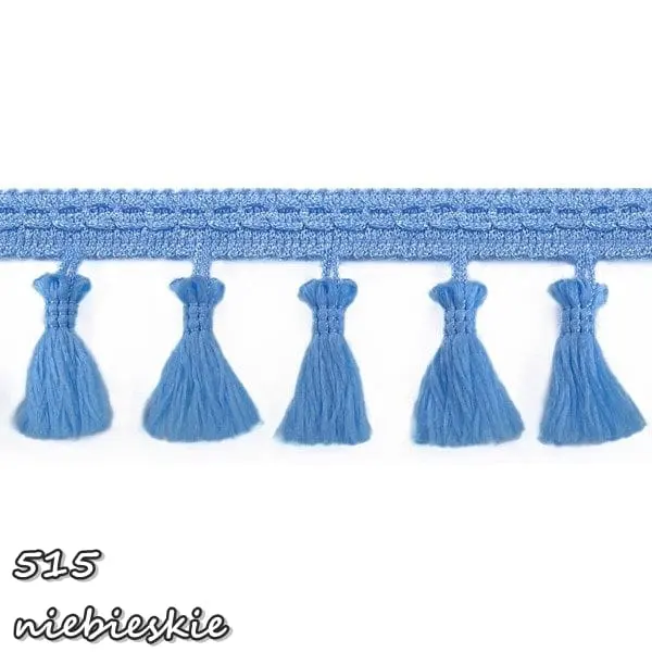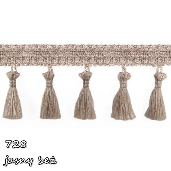 Delikatna taśma ozdobna z chwościkami. Idealna do obszywania zasłon, poduszek, koców, pledów, dziecięcych namiotów.