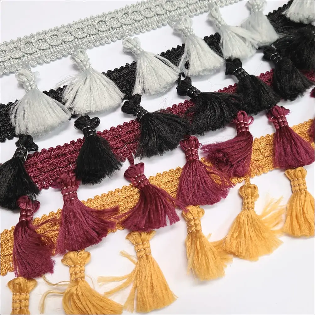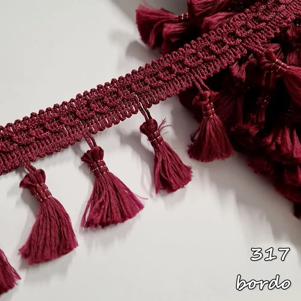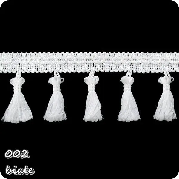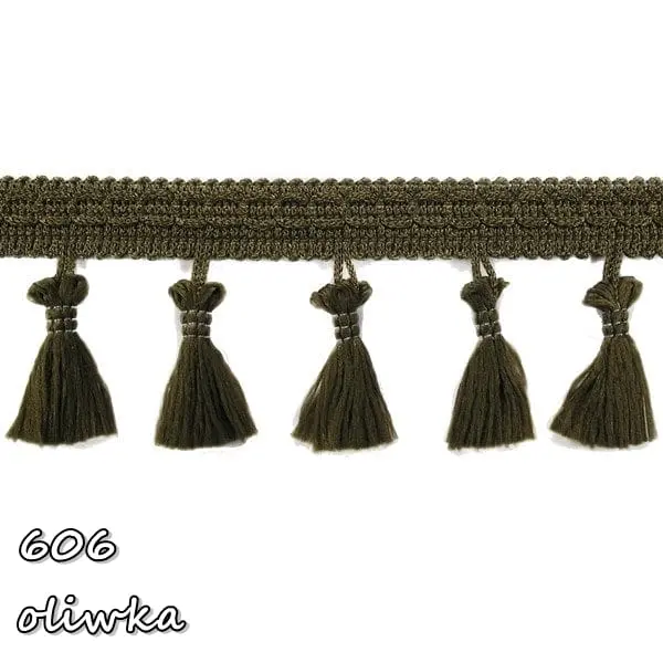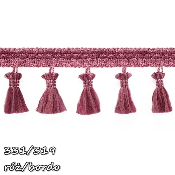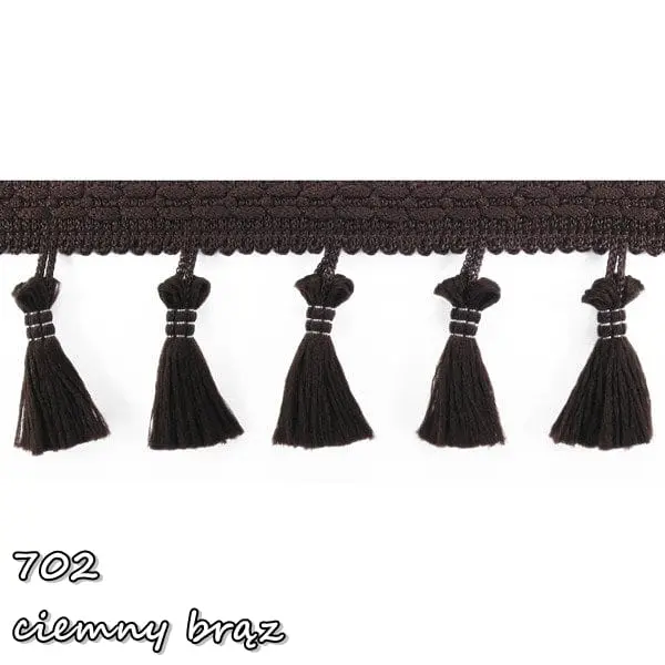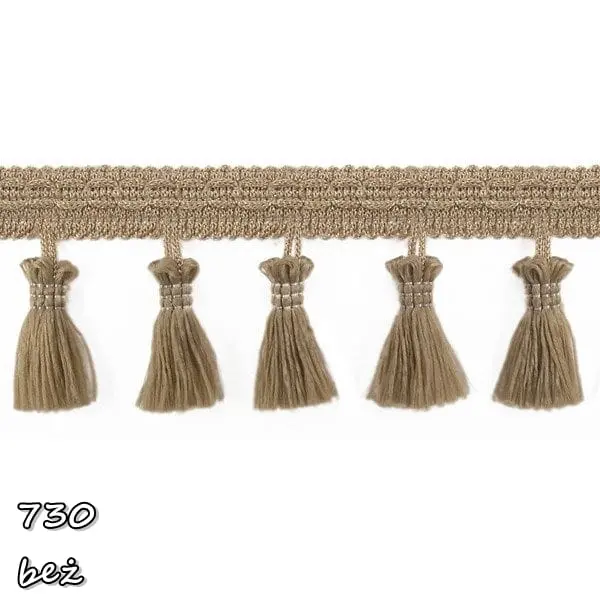 Delikatna taśma ozdobna z chwościkami. Idealna do obszywania zasłon, poduszek, koców, pledów, dziecięcych namiotów.