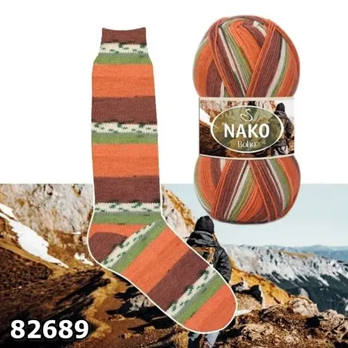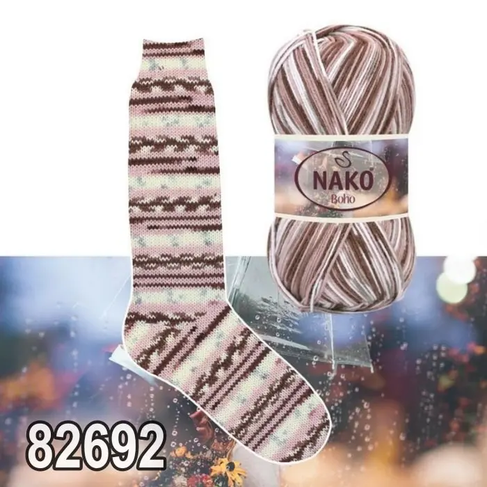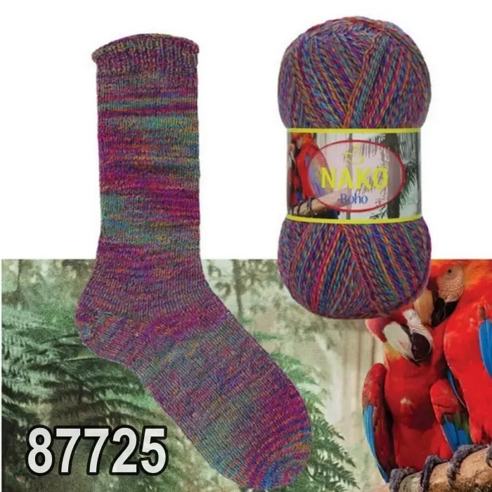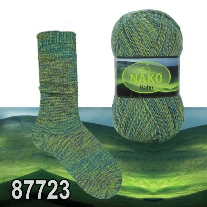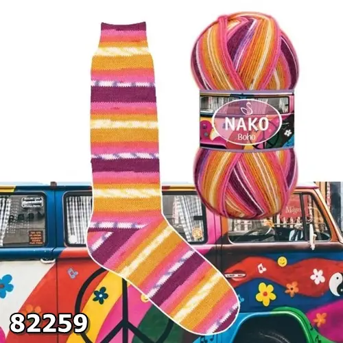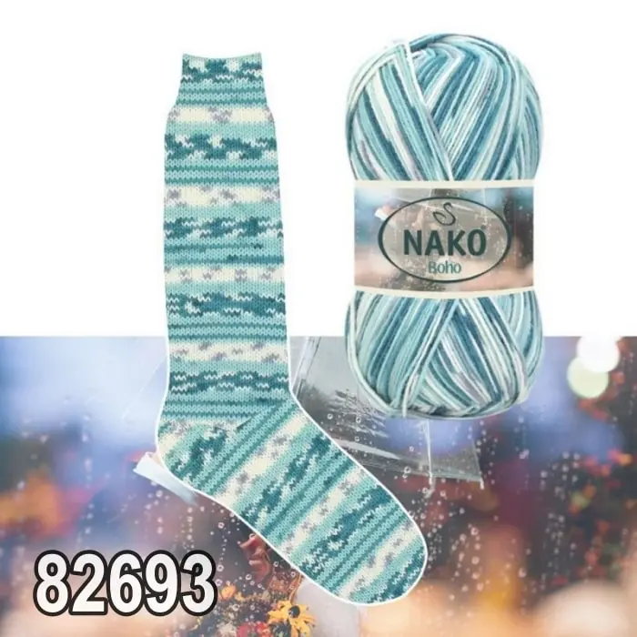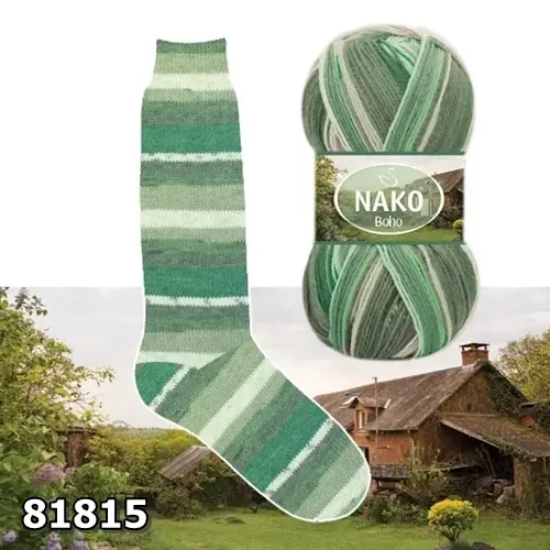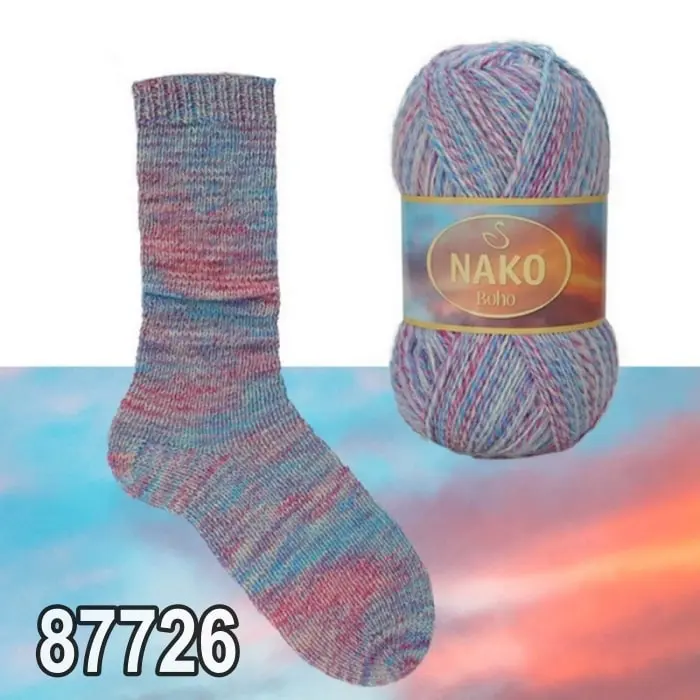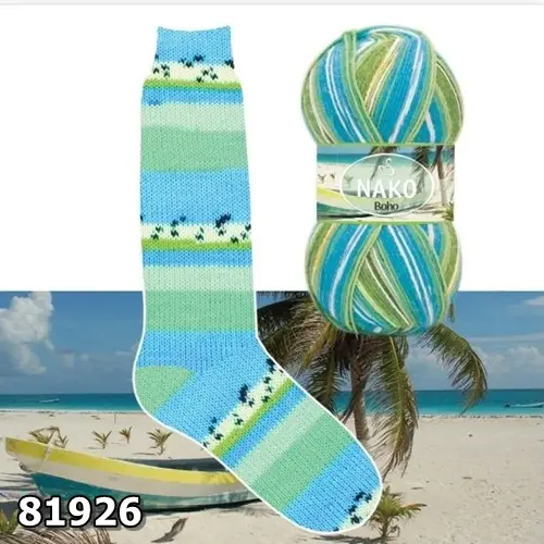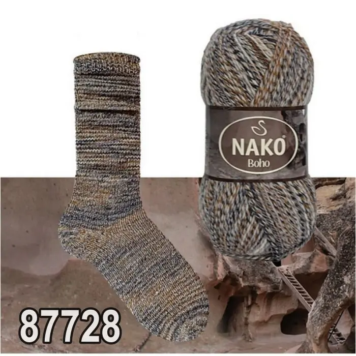 Nako Boho to cienka ciepła włóczka, która można używać cały rok. Połączenie dużej ilości wełny i poliamidu sprawia, że będzie idealną włóczką skarpetkową