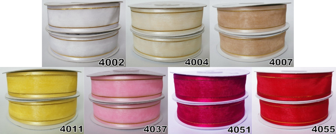 Wstążka szyfonowa z satynowym brzegiem z dodatkiem złotej niteczki.