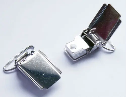 Zapięcie do szelek w kolorze srebrnym, posiada bardzo mocny zacisk.