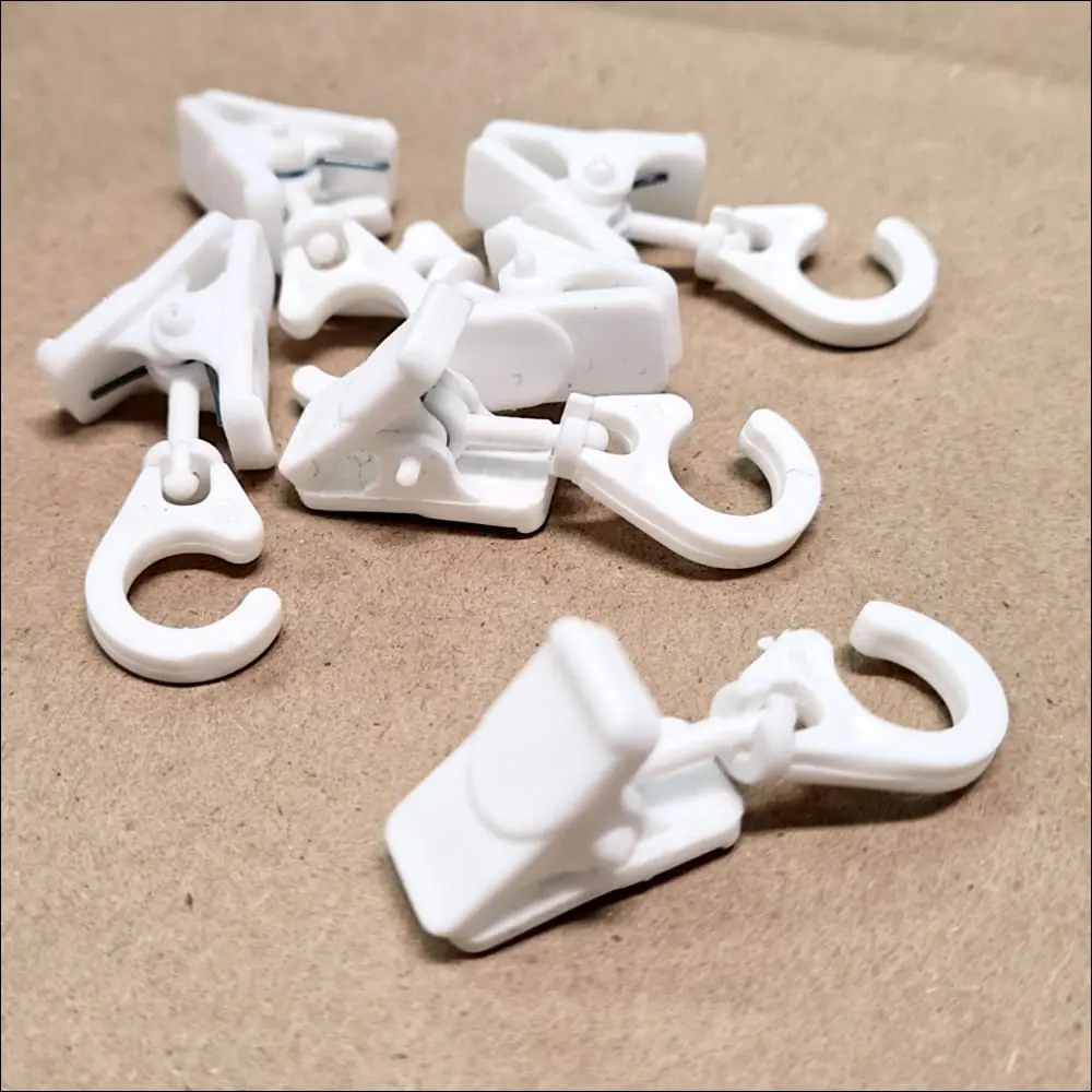 Żabki z haczykiem do zawieszenia na kółku do karnisza. Żabka jest obrotowa co pozwala na wygodne przypięcie materiału.