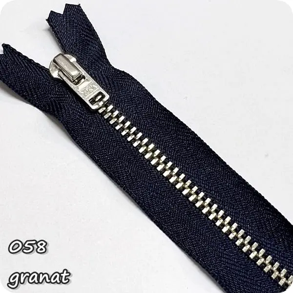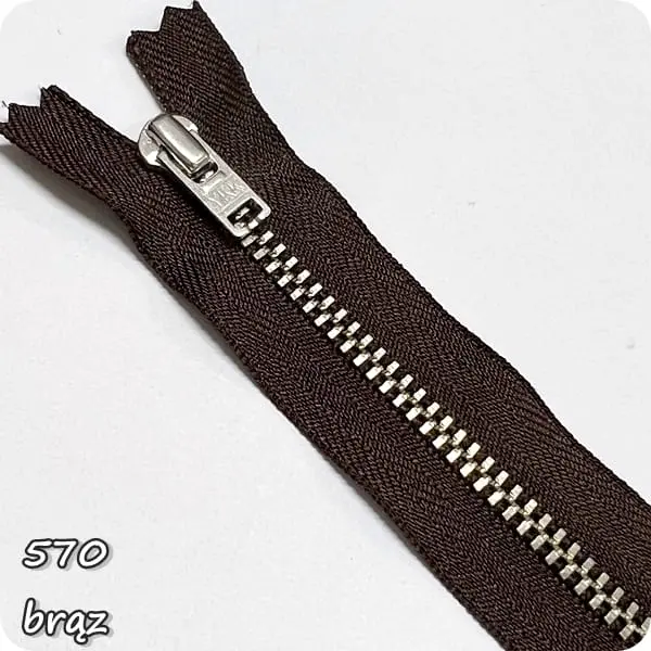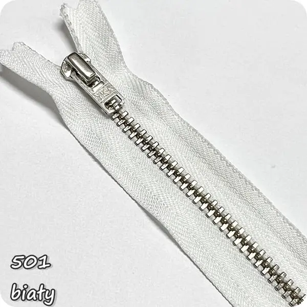 Zamek metalowy nierozdzielczy, niklowany, ze srebrnymi ząbkami.