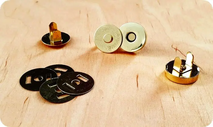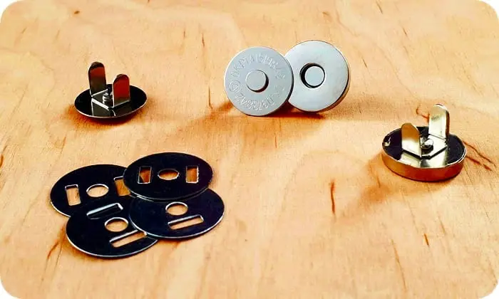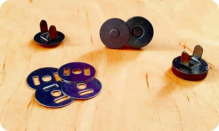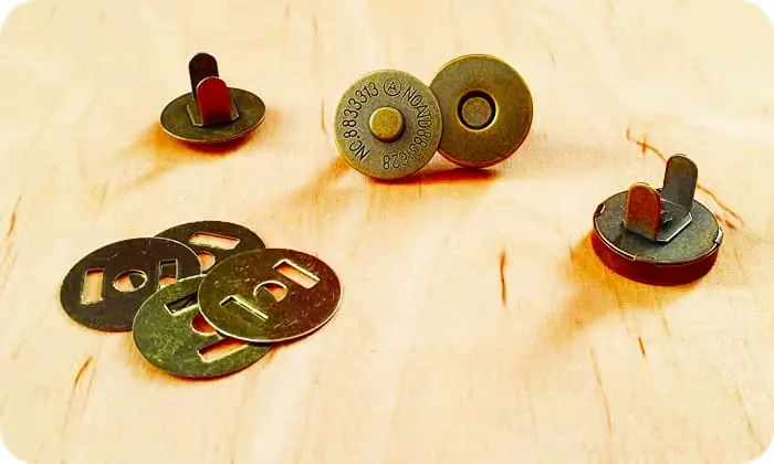 Zapięcie na magnes do torebek w powłoce galwanicznej. Posiadają podkładki, które wzmacniają o ochraniają materiał przed uszkodzeniem. Po obu stronach zapięcia znajdują się bolce do wpięcia w materiał.