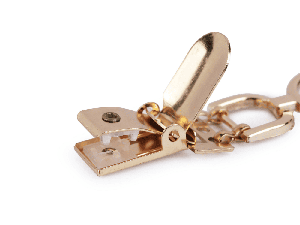 Zapięcie ozdobne 2,1×15 cm (360690) mocowane jest do odzieży za pomocą klamer znajdujących się na końcach. Najczęściej przypina się je z tyłu, w miejscu pasa, aby uzyskać efekt dekoracyjnego spięcia lub delikatnego modelowania sylwetki. Wymiary 2,1 cm szerokości i 15 cm długości zapewniają proporcjonalny, estetyczny wygląd bez nadmiernego obciążenia stylizacji.